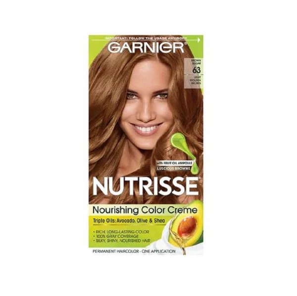 Garnier Nutrisse Light Golden Brown 63 (Brown Sugar) has radiant, golden tones that will add warmth to your results and will provide 100% gray coverage. This shade is best for anyone with natural hair between medium blonde and dark brown.