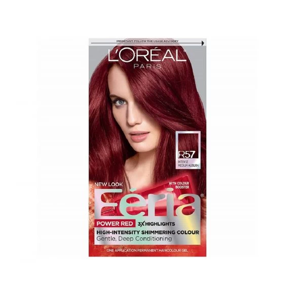 Product Description Of L’Oreal Paris Feria Multi-Faceted Shimmering Permanent Hair Color, R57 Cherry Crush (Intense Medium Auburn