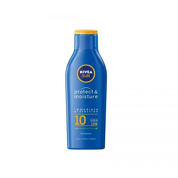 NIVEA SUN Protect & Moisture Sun Lotion SPF 10 provides you with long-lasting and intensive moisture. The formula is readily biodegradable and water-resistant. Get highly effective UVA and UVB protection that immediately protects you against sunburn and premature skin aging. Before sun exposure, apply sunscreen generously and reapply frequently, especially after swimming, perspiring and toweling. The skin compatibility of this sunscreen has been dermatologically proven.